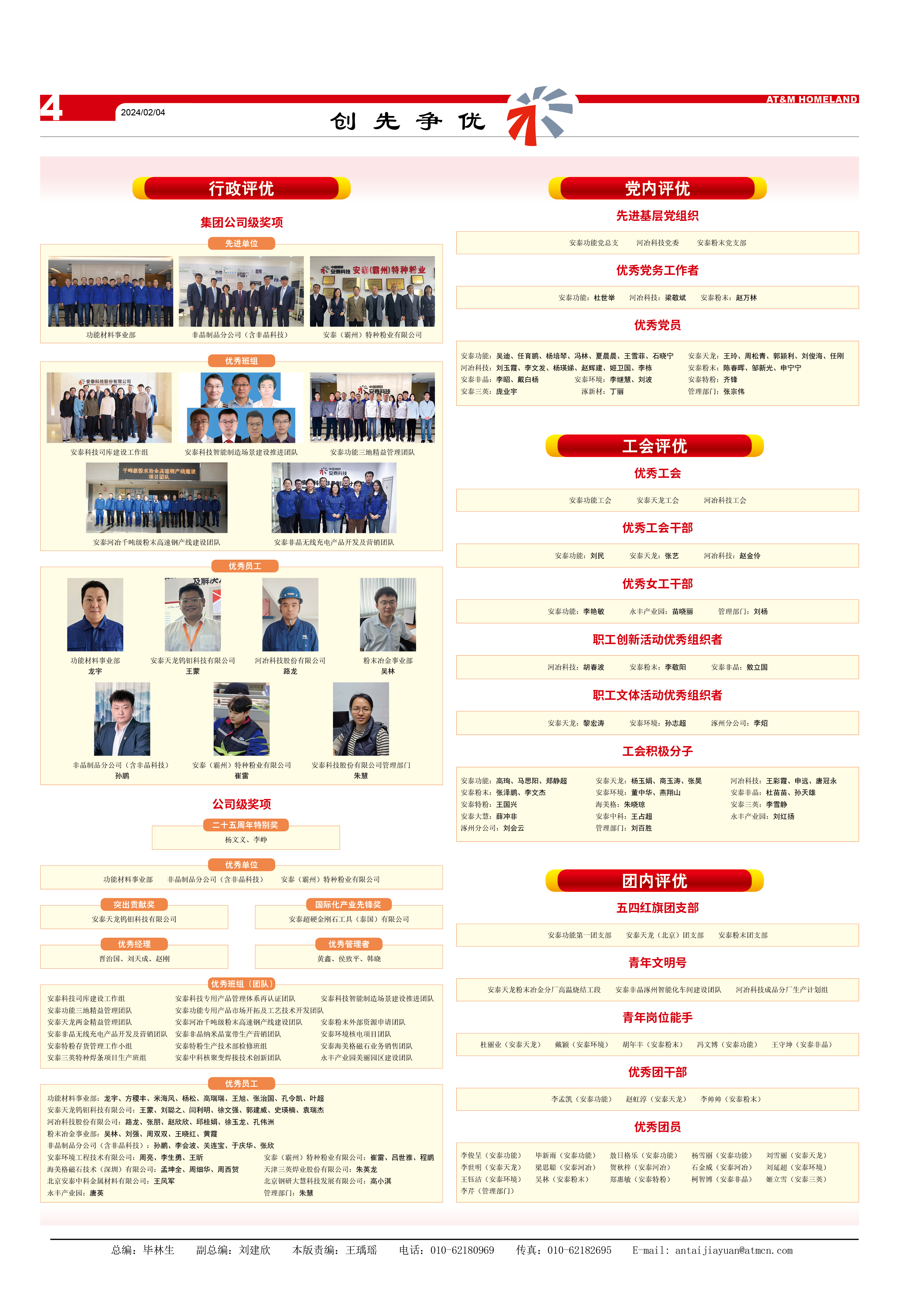 李俊呈(安泰功能)、畢新雨(安泰功能)、敖日格樂(lè)(安泰功能)、楊雪麗(安泰功能)、劉雪麗(安泰天龍)、李世明(安泰天龍)、梁思聰(安泰河冶)、賀秋梓(安泰河冶)、石金威(安泰河冶)、劉延超(安泰環(huán)境)、王鈺潔(安泰環(huán)境)、吳林(安泰粉末)、鄭惠敏(安泰特粉)、柯智博(安泰非晶)、姬立雪(安泰三英)、李芹(管理部門(mén))